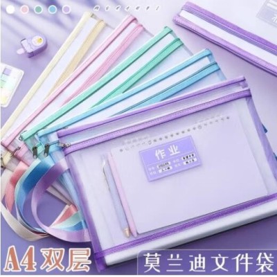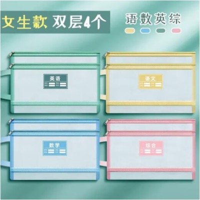 透明网格学科科目分类袋双层A4文件袋小学生试卷收纳袋拉链袋透明书袋课本分科学习资料手提袋 【双层女生款4个】