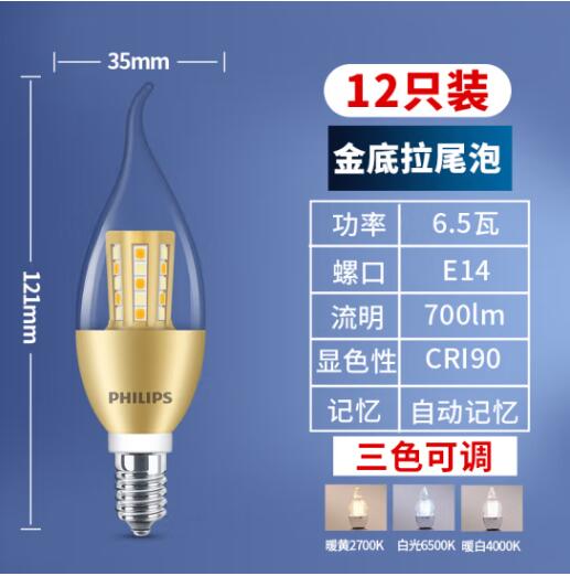 e14螺口led灯泡三色变光超亮蜡烛灯泡拉尾水晶小螺口吊灯家用节能 三色变光【6.5瓦金底拉泡】12只